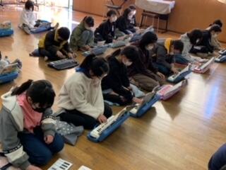 左の写真は、4年生の音楽の様子です。現在、鍵盤ハーモニカを吹くことは控えています。教師による