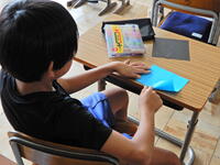 算数では折り紙を自分で降りながら四角形の辺や角について確認していました