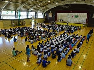 本日の朝はさわやかタイム。体育館でプール開き集会です。