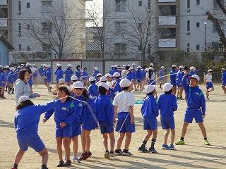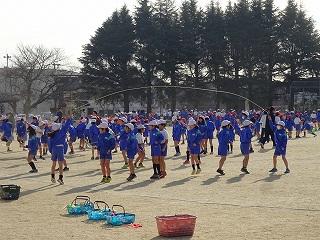 本日の朝のさわやかタイムは、なわとび大会です。どのクラスも今までの練習の成果を発揮して頑張りました。元気に声をかけながら、足を合わせています。