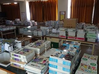 ↑ 新しい教科書も届いています。学年やクラスごとに並べ、新学期に配布できるようになっています。
