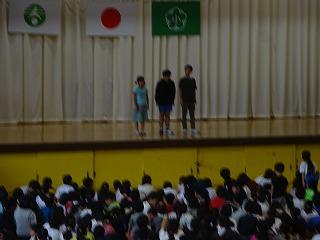 本日の朝は、集会委員の進行で、体育館で児童集会です。集会委員のモデルの1回目と2回目の登場で変わったところを、グループごとに相談して見つけます。