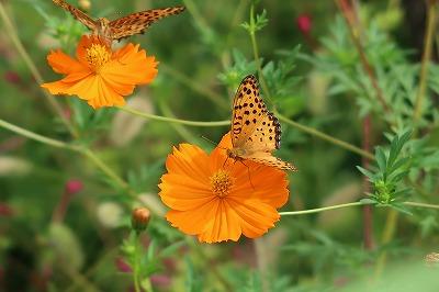 きれいに咲き始めたキバナコスモスの蜜をすいに、ツマグロヒョウモンがやってきました。
