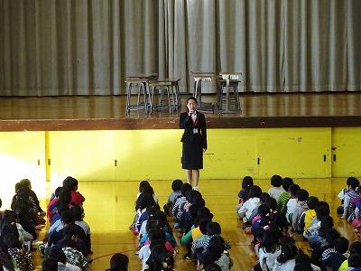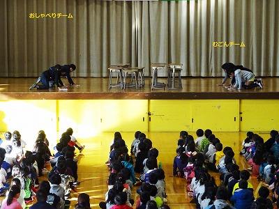 月ごとの生徒指導のお話では今月がんばってもらいたい「無言清掃」についてのお話がありました。5年生の子達が寸劇で、お話しながら掃除をしている子と無言で掃除をしている子の2チームにわかれて掃除の様子を見せてくれました。