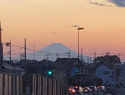 (↓ 夕焼けの春日部市内。遠くに富士山のシルエットが見えます。)