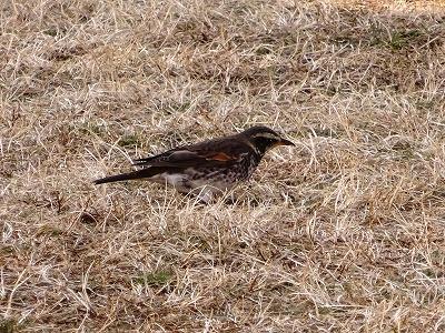 日差しが少なく寒い一日でした。中庭の芝生では、つぐみが一生懸命えさを探していました。