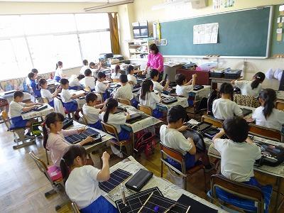 3年生は初めての習字の授業です。今日は新しい習字道具を広げて、机の上にどうやって並べるか、ということから学習をはじめていました。