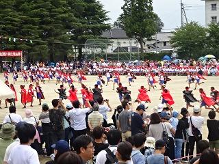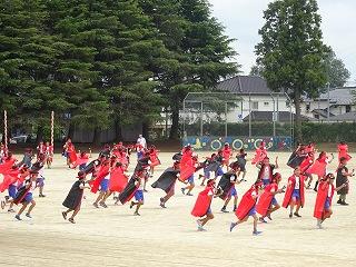 11:30 4年生のよさこいソーラン節が始まります。赤と黒の衣装を着用して鳴子を鳴らして、キレのある踊りを披露します。