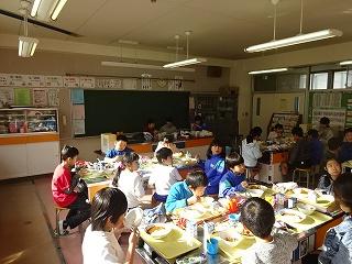 (↑ 給食の様子。班ごとに集まって、6年生中心に準備をしたり、楽しく話したりしながら会食しました。)