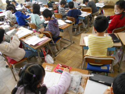1年生は国語のワークテスト、2年生は生活科で「じぶんものがたり」に取り組んでいました。