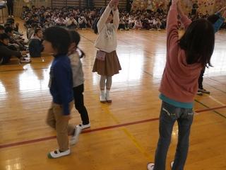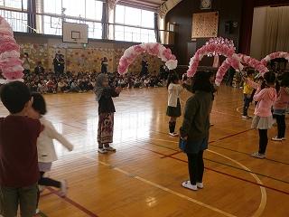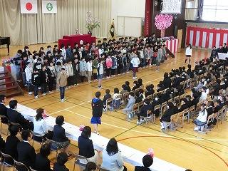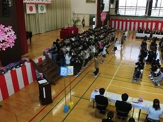 ↑ 6年生が、一年生を迎える歌や合奏、ダンスを披露しました。最高学年らしい立派な態度でした。無事に入学式が終了して、一年生は教室へ向かいました。