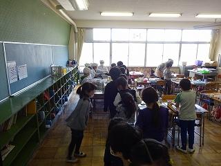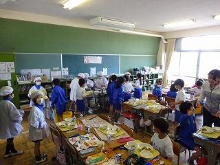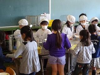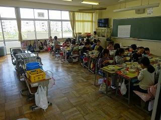 2~6年生は、昨日から給食が始まっています。教室では当番さんがしっかりと配膳の準備を進めて、まわりの児童も協力して給食が進んでいます。