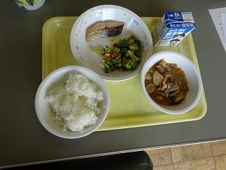 (↑ 写真は2年生の様子です。今日の給食は、ごはん、牛乳、鮭の塩焼き、ブロッコリーのごま和え、筑前煮、でした。)