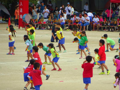 13:25 2年生による大玉転がしです。13:35 1年生によるダンスが始まります。13:45 4年生によるぐるぐるタイフーンが始まっています。