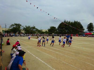 14:10特別種目、 PTAと職員によるデカパンリレーが始まります。14:20 運動会もあと2種目となりました。高学年代表リレーが始まります。