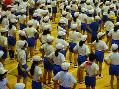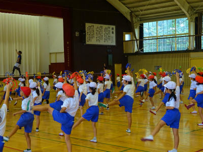 新学期2日目、本日の朝は曇りです。今日から学校全体での運動会練習が始まります。朝の業前は全校児童で桜っ子音頭の練習です。体育館に集まって練習をしまし