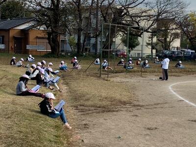 これは2年生の音楽授業の様子です。密を避けるため、校庭に出て鍵盤ハーモニカの練習をしました。友達との間隔も十分にとれます。今日は天候も良く、草の上に座って気持ちよく練習ができたようです。