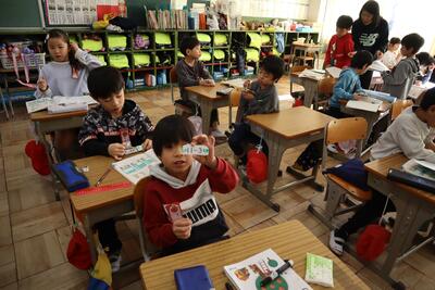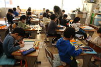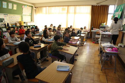 1年生は計算カードを次々とめくっています