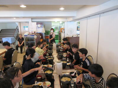 19:00 夕食の時間になりました。体調悪い人もなく、全員参加してます。