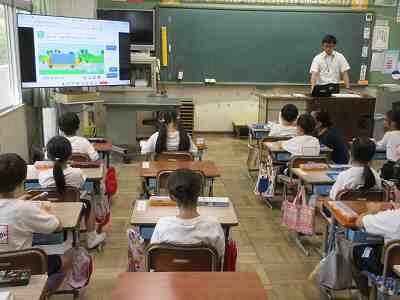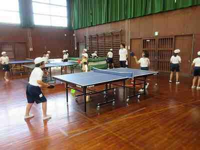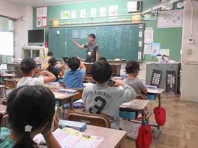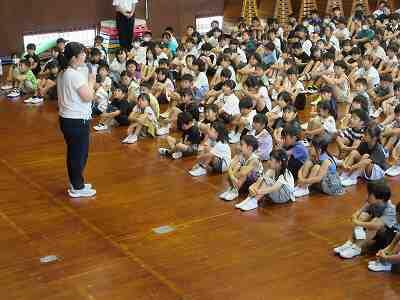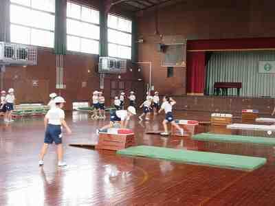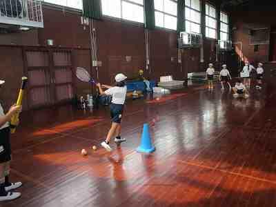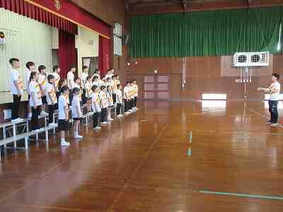 今日は猛暑日となり校庭での体育はできませんでしたが、空調設備のある体育館で、4年生がTティーボールの学習をしていました。