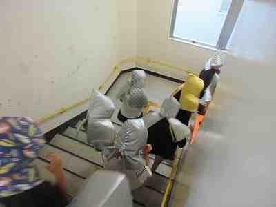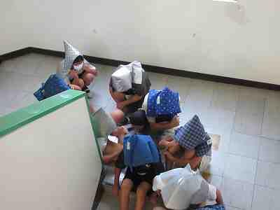 今日は、避難訓練を行いました。今回の避難訓練は、本震の後にすぐに余震が来たという設定で行いました。