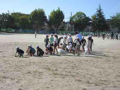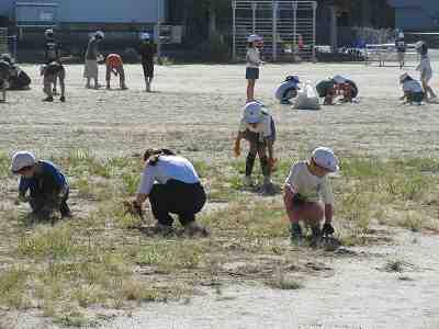 まもなく運動会の練習が始まります。それを前に、今日は業前活動の時間に全校児童で校庭の除草活動を行いました。