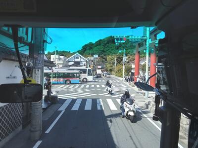 11:05 バスは鎌倉の鶴岡八幡宮の前まできました。道路が混んでいたので 予定よりも時間が遅れました。この後の班行動で時間を調整します。