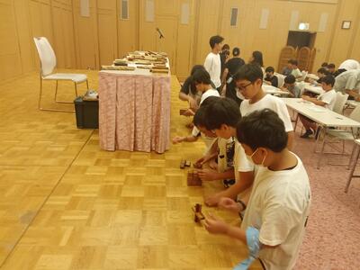 18:00 体験学習を行っています。箱根の寄木細工の職人さんに教わりながら、各自で思い思いのコースターを作っていきます。(全員参加しています )