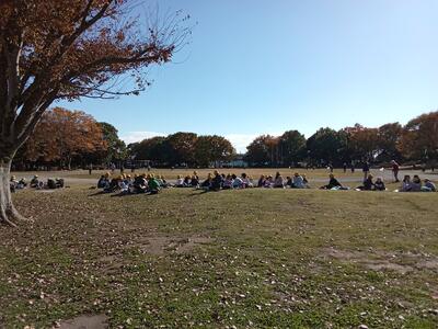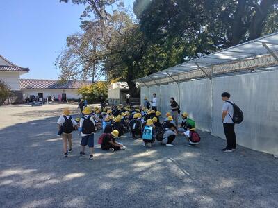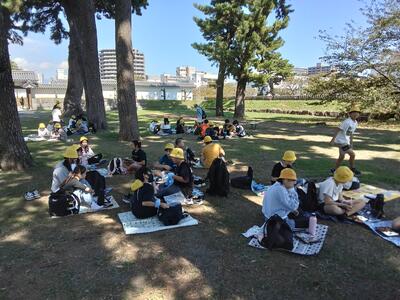 11:30 天守閣が見える芝生で昼食を食べます。体調の悪い人はいません。