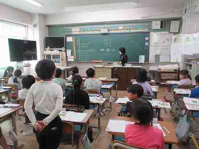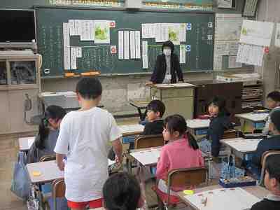 1年生は、飼育小屋のウサギのようすを観察していました。また、教育実習生に道徳の授業を見てもらっていました。