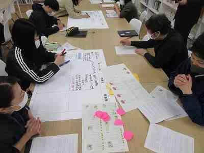 子どもたちは、自分の考えを付箋カードに書いたり、ワークシートにまとめたりしていました。