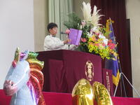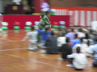 体育館では、記念式典の第一部として、式典実行委員長と校長のあいさつがあり、また来賓の方々よりお祝いお言葉をいただきました。