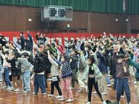 ( ↑ 第二部の最後は、全校合唱『夢をさがそう』です。合唱団の中学生も、事前に歌や振付を学習してきてくれて、児童と一緒に歌いました。)