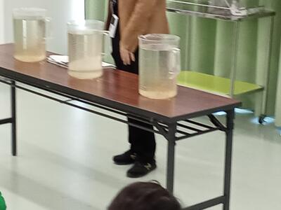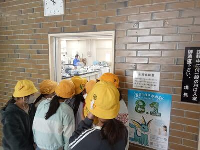9:50 クラスごとに分かれて見学が始まっています。浄水場の方に説明をしてもらっています。