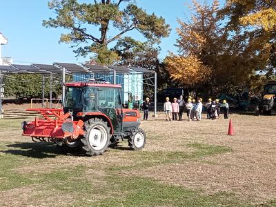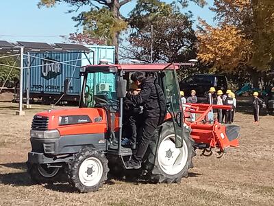 (リモコンの草刈り機を動かしたり、自動操舵のトラクターに乗車したりしています。)