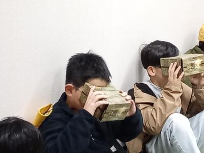 (VR=バーチャルリアリティーのゴーグルをつけて、立体映像を体感してみます。危険予測や安全確認のための映像を体験します。)