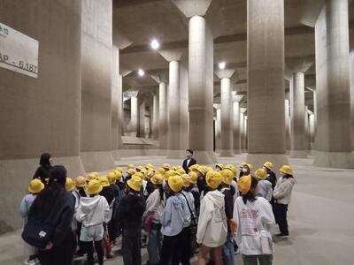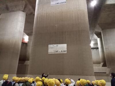 14:25 小さな川の水をため込んで、春日部地域やその周辺の水害を防いでいる首都圏外郭放水路や調圧水槽の仕組みを見学しています。
