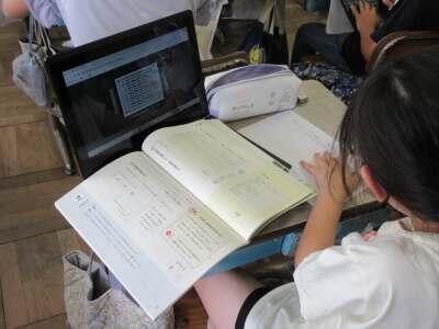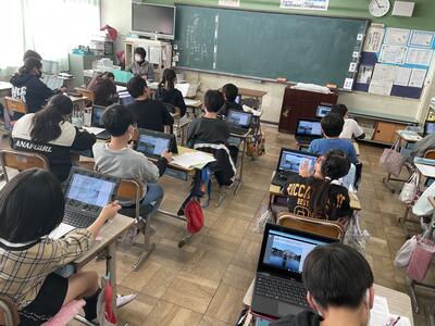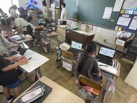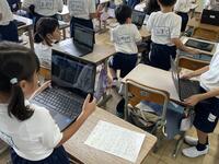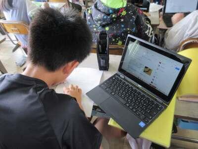 5年生が教室で、1人1台のタブレットを使いながら、3年生と一緒に活動するための準備を進めています。