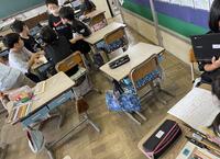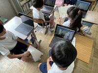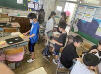 一学期中の4年生の理科の授業の様子です。1人1台のタブレットを使用して、子供たちが学校敷地内のあちこちで、土が水にしみ込む様子を動画で撮影してきました。