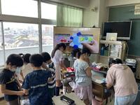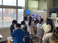 教室に持ち帰り、撮影した動画を大型モニターにリモートで投影して、撮影者が動画を見ながら説明をします。子供たちは、いろいろな場所での後、しみ込み方の違いを観察します。