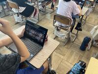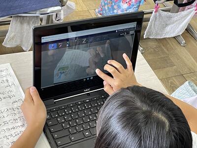 6年生が、1人1台のタブレットを活用しています。自分が撮影した写真や、インターネットからダウンロードした画像を先生機に送ったり、友達と共有したりする機能があります。