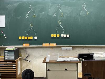 考え方や解き方は、黒板で説明したり、各自のノートに記入したりします。授業の中で、デジタル(タブレットやモニターなどのICT機器)とアナログ(手書きの黒板やノート)を上手に併用して、学習に取り組んでいます。