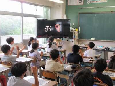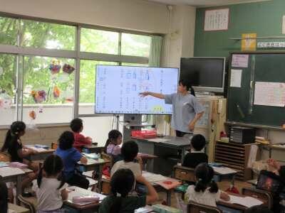 1年生では、国語の学習で大型提示機に言葉を映し出して学習していました。