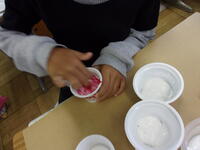 カップに小分けした粘土に絵の具を入れ、手でかき混ぜていますが、その感触に悲喜こもごもです。