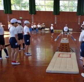 昼休みに跳び箱教室が行われました。今日は、開脚跳び5段を17人の子どもたちが跳べるようになりました。