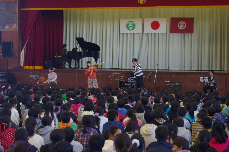 今年度の芸出鑑賞会は、音楽グループ「BZ(ビージー)」の方々に来ていただき、歌や楽器演奏を鑑賞しました。子どもたちのリコーダーなどの演奏ともコラボしていただき、楽しく鑑賞できました。