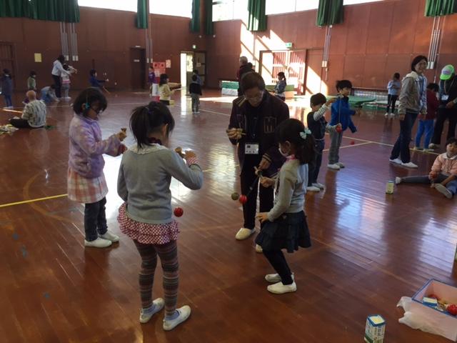 2年生が生活科で遊びランドを行いました。手作りの遊びをつくり、1年生とまどか幼稚園児の年長組のみなさんを招待して遊んでもらいました。1年生が園児の手を取り案内しながら、楽しそうに遊んでいました。とてもほほえましく感じました。