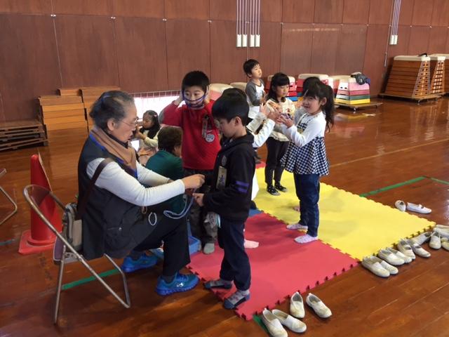 1年生のいっしょに遊ぼう会に地域の敬老会の方々がお出でいただき、こま回しやおはじき、めんこ、お手玉などの昔あそびをいっしょに教えていただきました。その後、給食も一緒に食べていただきました。どうもありがとうございました。