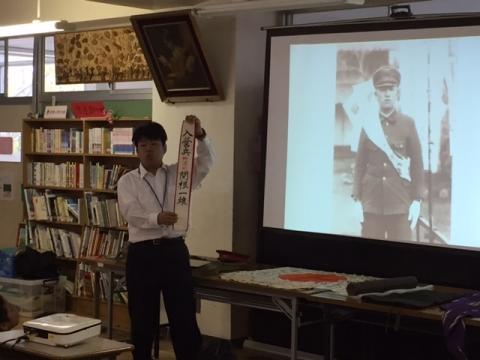 6年生がピースキャラバンの授業を受けました。埼玉県平和資料館の方に戦争時代の実物資料やスライドを見せていただきながらお話を聞きました。戦争や平和について学ぶ大変学習になりました。
