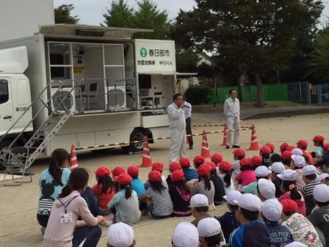 避難訓練において、春日部市の防災対策課の方においでいただき、地震体験車による地震体験をおこないました。6年生が震度6強の地震を体験しました。想像以上の揺れに、あらためて地震の恐ろしさを感じることができました。
